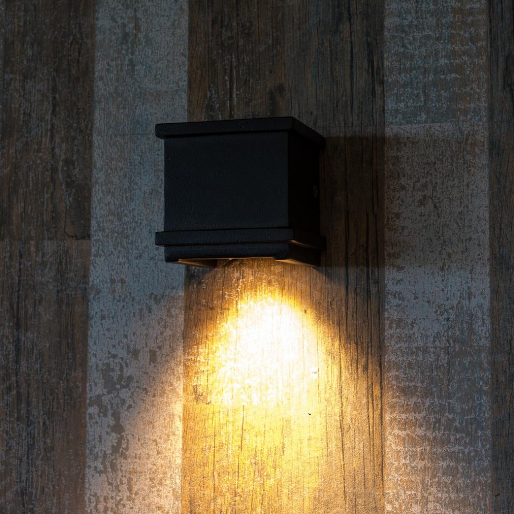 Robust väggbelysning, downlight. Nedåtgående ljusutsläpp skapar effektfullt ljussken på fasad eller plank.