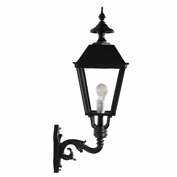 Vår fasadbelysningen är fyrkantig med en nätt spira på toppen av lyktan. Äkta glas återger en vacker ljusbild. Det böjda handgjutna väggfästet blir ett fint smycke med lykthuset på din fasad, en fasadlykta som drar blickarna till sig i sin enkla och genuina klassiska design. Den klassiska vägglampa har porslinssockel med E27 fattning, det går även bra att använda LED i våra armaturer.