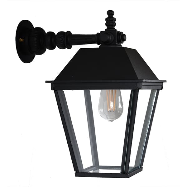 Armen och lyktan är tillverkad i solid handgjuten aluminium, vilket gör denna utebelysning lätt att fästa på väggen. fasadbelysningen är pulverlackerad två omgångar för bästa skydd, med matt svart struktur-färg, för en gammaldags genuin känsla. Denna klassiska lampa är omtyckt då materialet ej gör att den rostar och att den är så underhållsfri, en vägglykta för generationer. Denna klassiska utebelysningen för vägg är vacker på många ställen, ex. ovanför dörrar, jämte dörrarna vid entren eller på husfasaden.