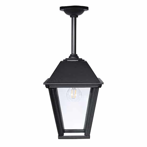 Lyktan är tillverkad i solid handgjuten aluminium, vilket gör denna lykta lätt att fästa på taket. Vår lykta i kedja är pulverlackerad två omgångar för bästa skydd, med matt svart struktur-färg, för en gammaldags genuin känsla. Denna klassiska lampa är omtyckt då materialet ej gör att den rostar och att den är så underhållsfri, en vägglykta för generationer. Klassisk lykta är vacker belysning på din veranda eller altan.