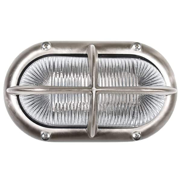 Vägglampa i marin stil med solid mässing och matt förnicklad. Riktigt gedigen armatur som tål saltvatten. Armaturen har klarglas men finns även i en frostad version. Snyggt galler i mitten av denna väggbelysning. Riktigt snygg belysning till din Pool.