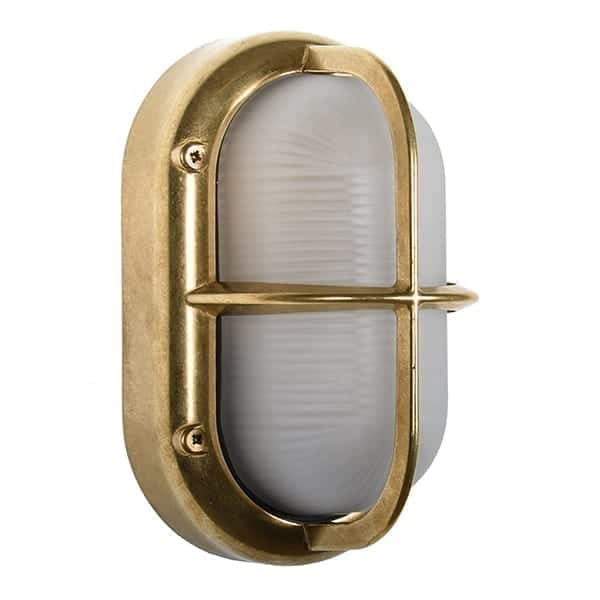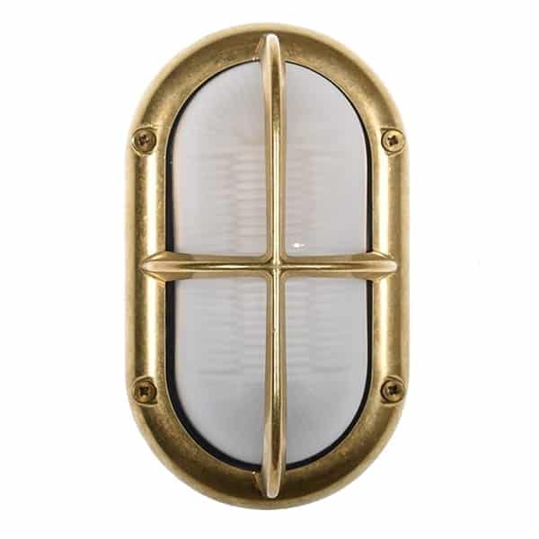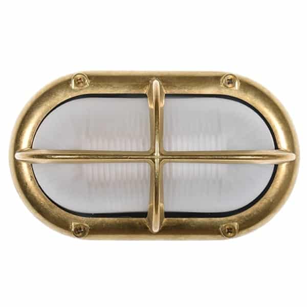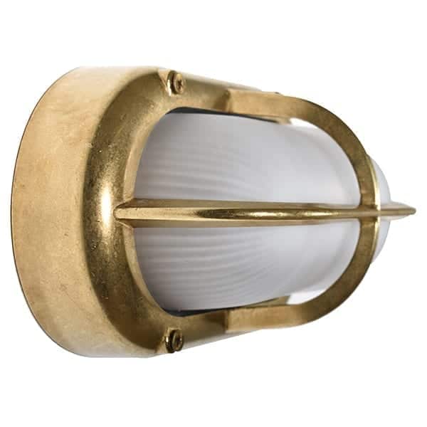 Vägglampa marin stil med solid mässing. Riktigt gedigen armatur som tål saltvatten. Armaturen har frostat glas men finns även i en klarglas version. Snyggt galler i mitten av denna väggbelysning. Lampan kan även användas inomhus till ex ditt badrum då armaturen har en ip klass 64. Även en trevlig belysning till din pool.