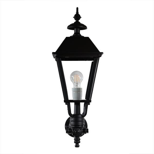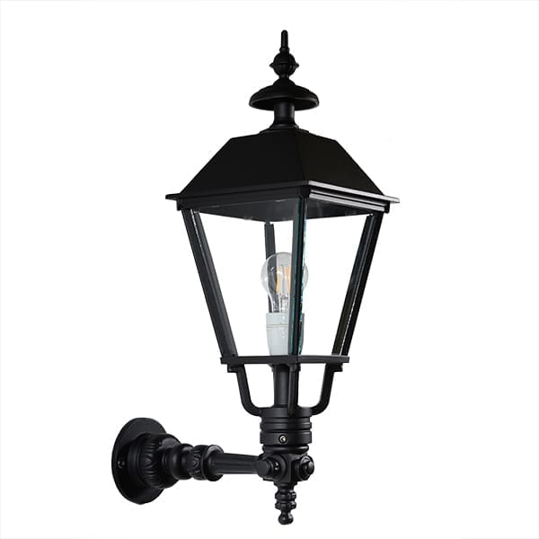 Vår utelampa har en 4 kantig lykta med en vacker spira på toppen. Äkta glas återger en vacker ljusbild. Det böjda handgjutna väggfästet blir ett fint smycke med lykthuset på din fasad, en fasadbelysning som drar blickarna till sig i sin enkla och genuina klassiska design. Den klassiska vägglampa har porslinssockel med E27 fattning, det går även bra att använda LED i våra armaturer.