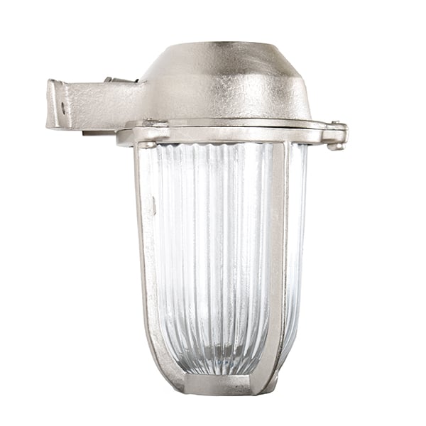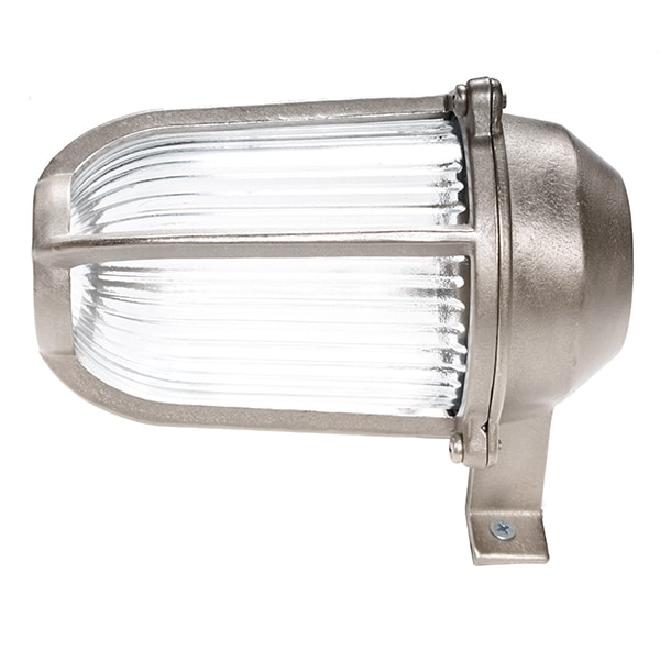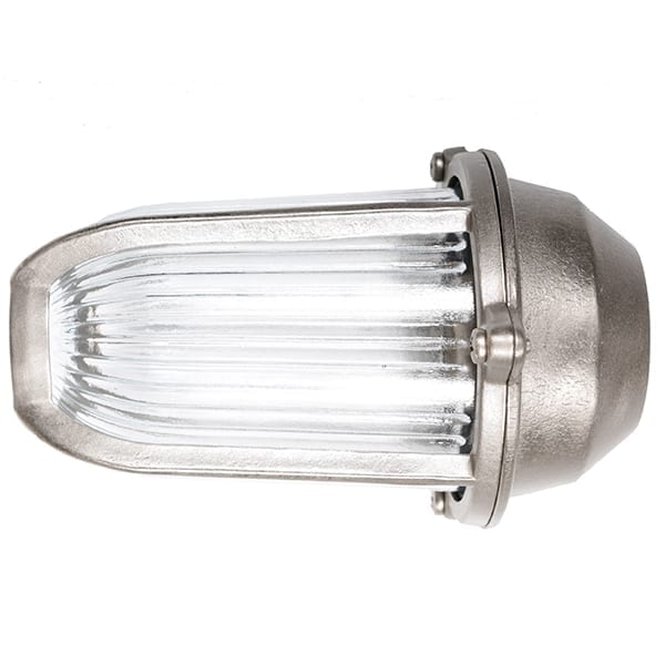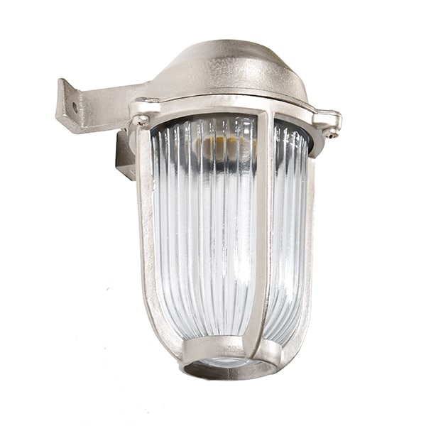 Väggbelysning med marina designen är här hämtad från gamla tidens skeppslampor. Denna väggbelysning är tillverkad i solid mässing med matt förnickling och är väldigt väderbeständig även i miljöer med hög salthalt. Vägglampan är vacker och passar många stilar new- england huset, marina stilen eller varför inte på en modern svart fasad? Vackra detaljer så som ett galler täcker klarglaset i vägglampan.