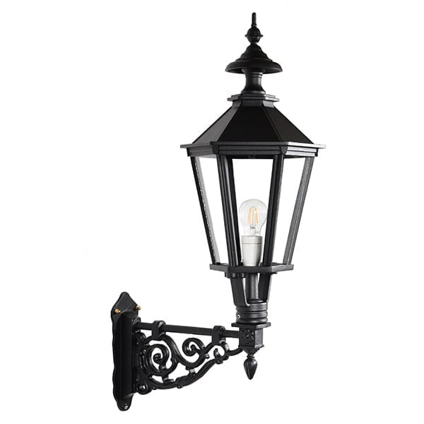 Vägglampa är sexkantig och har äkta glas som återger en vacker ljusbild. Det vackra ornamenterade väggfästet blir ett fint smycke med lykthuset på din fasad, en lykta som drar blickarna till sig i sin enkla och genuina klassiska design. fasadlyktan har porslinssockel med E27 fattning, det går även bra att använda LED i våra armaturer.