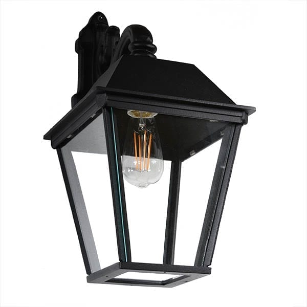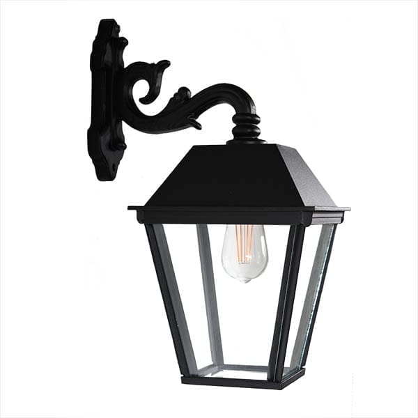 Armen och lyktan är tillverkad i solid handgjuten aluminium, vilket gör denna utebelysning lätt att fästa på väggen. fasadbelysningen är pulverlackerad två omgångar för bästa skydd, med matt svart struktur-färg, för en gammaldags genuin känsla. Denna klassiska lampa är omtyckt då materialet ej gör att den rostar och att den är så underhållsfri, en vägglykta för generationer. Denna klassiska utebelysningen för vägg är vacker på många ställen, ex. ovanför dörrar, jämte dörrarna vid entren eller på husfasaden.
